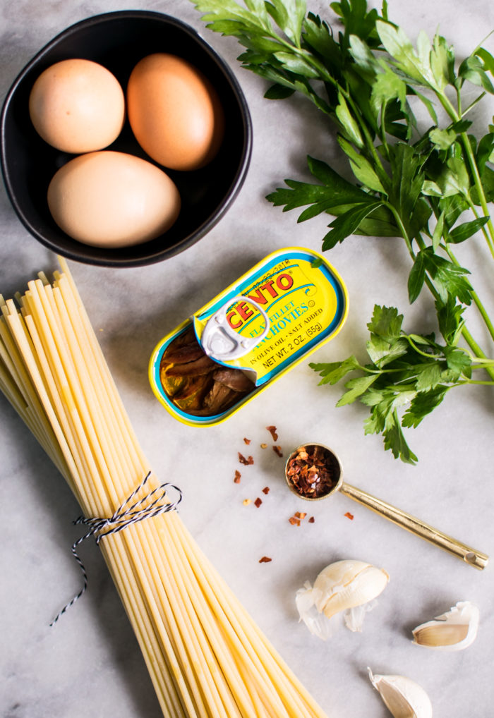 Traditional carbonara consists of pasta, egg, guanciale (pork jowl), pecorino, and pepper. Using anchovies in place of the guanciale and pecorino in this recipe makes it a bit lighter but keeps that salty flavor. If you're an anchovy lover like I am, you'll love this! Instead of black pepper, there's red pepper flakes and a garnish of fresh parsley to compliment the anchovy. Most of these ingredients you probably already have!