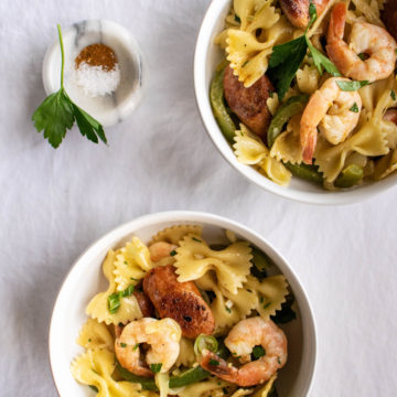 This recipe is a new favorite of mine! I wanted to play around with Cajun flavors, and because I love pasta so much, I decided to make a Cajun pasta salad. With green peppers and onions, smoky andouille sausage, shrimp, and a zesty dressing—this recipe is packed with flavor!