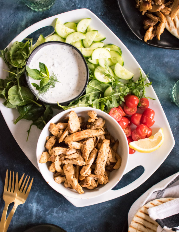 I like to serve the chicken with the tzatziki, warm pita, cucumbers, tomatoes and some kind of leafy greens. You could also add red onion to the spread if that's your thing. Serving everything on a platter makes it easy for people to choose how they'd like to eat it. They can make a wrap with the pita or maybe a Greek salad. Plus, it looks really pretty served this way. Don't forget to put a few lemon wedges out there for a little spritz of brightness!