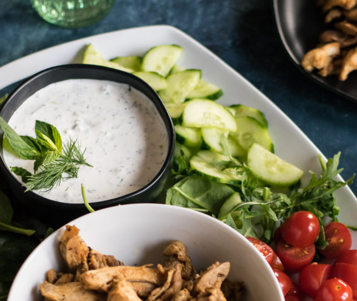 - Serve the chicken with the tzatziki, vegetables and warm pita.