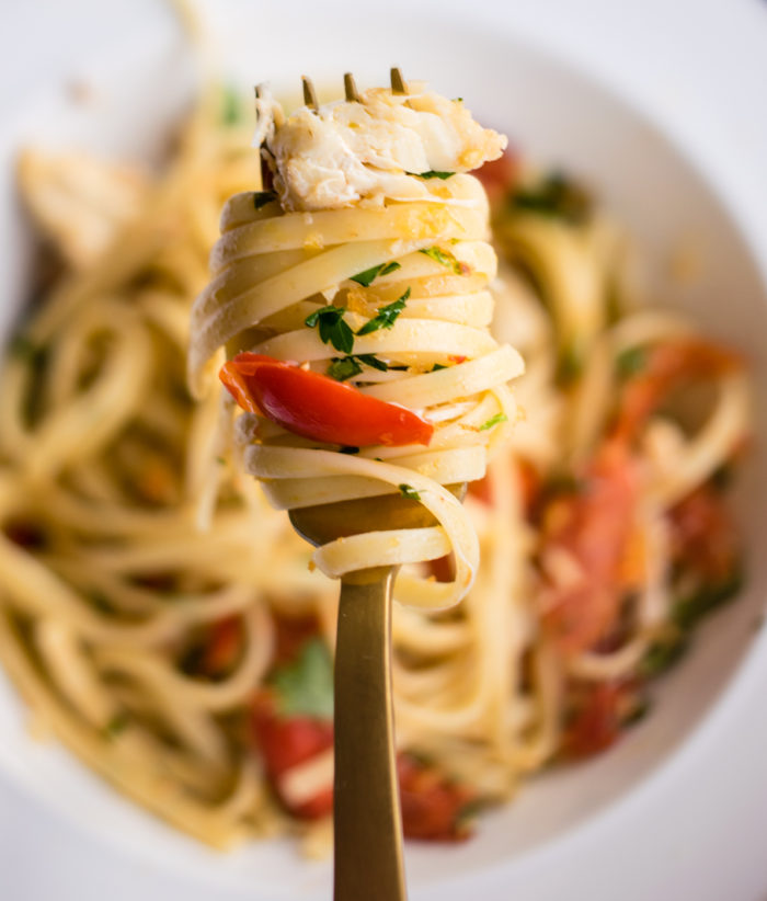But seriously, pickled peppers are a perfect addition to pasta because they have a really great acidity and bite that balances the carbs of the linguine. There are tomatoes in the sauce but they're sort of filler tomatoes and they certainly come second to the real stars of the dish; the peppers and the crab. If you haven't noticed by now, I LOVE pasta and my favorite pastas are always the seafood ones. That's why creating recipes like this one, makes me so happy!