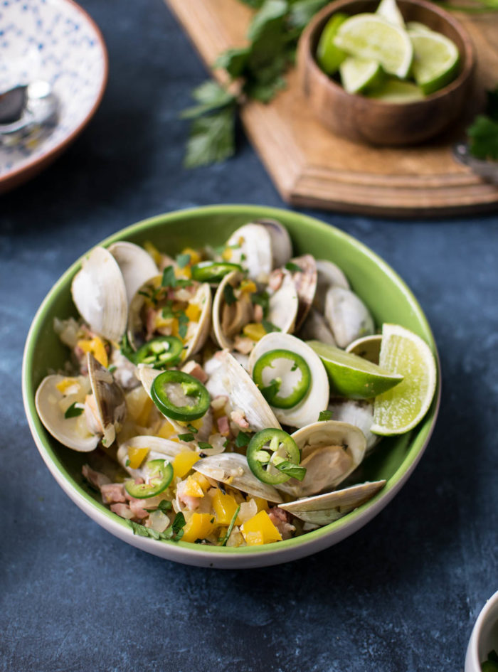 - Divide the clams between four bowls and top with the jalapeño slices and parsley. Serve with lime wedges.